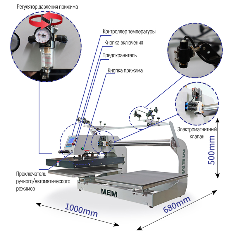 Внешний вид и управление Конструкция пневматических двухстанционных термопрессов MEM сочетает в себе прочный каркас пресса промышленного класса с высококачественными электрическими и пневматическими комплектующими. Контроллер использует легко читаемый жидкокристаллический дисплей с крупными цифрами для одновременного отображения времени и температуры. С помощью регулятора температуры можно легко установить желаемые параметры нагрева и времени прессования. Пневматическое давление можно плавно регулировать с помощью редукционного клапана. С помощью ограничителя на электромагнитном клапане можно регулировать скорость опускания и подъема нагревательной плиты.