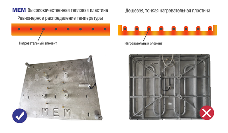 Вся серия термопрессов MEM оснащена толстыми литыми алюминиевыми тепловыми пластинами для обеспечения высококачественной теплопередачи.